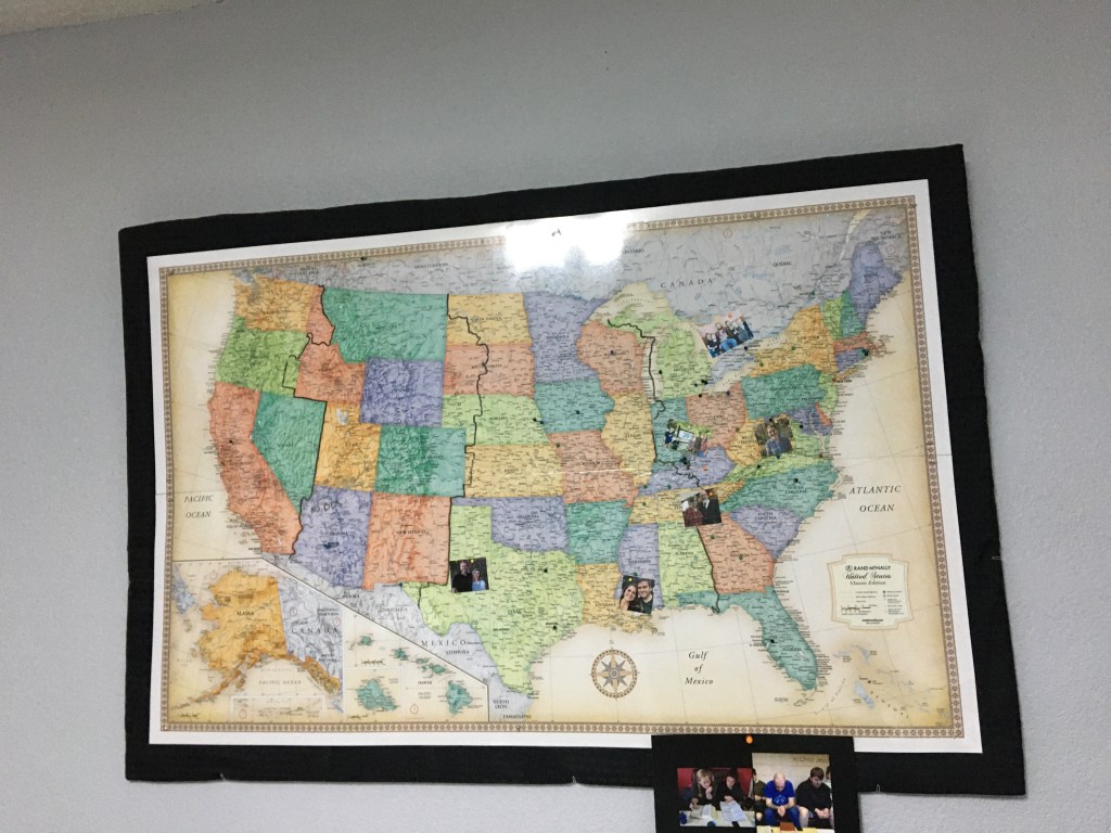 Inside 20schemes’ American office there is a map of Scotland with pictures of 20schemes international workers pinned to it. There is also a map of the US with pictures of people who are preparing to serve with 20schemes in Scotland. You can see my picture pinned on West Virginia 🙂