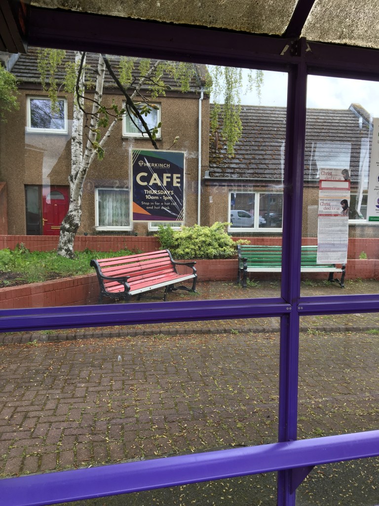 Below: the door to our church hall, café sign posted up in our local bus stop, and Katherine welcoming folks to the café last Thursday. 🙂