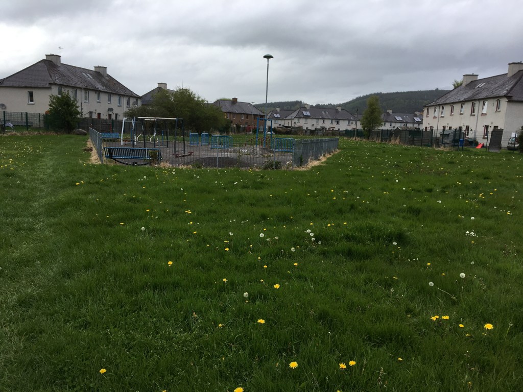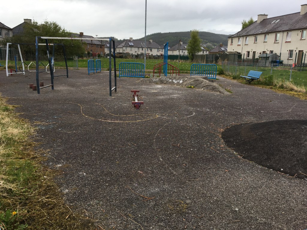 The South Kessock playground is a rather lonely place in the middle of an overgrown field. Most of the play things including the swings have all been taken. All that’s left are some metal poles and a patch of asphalt covered with broken glass. The locals know it as a place not for kids to play but for folks to gather to drink.
