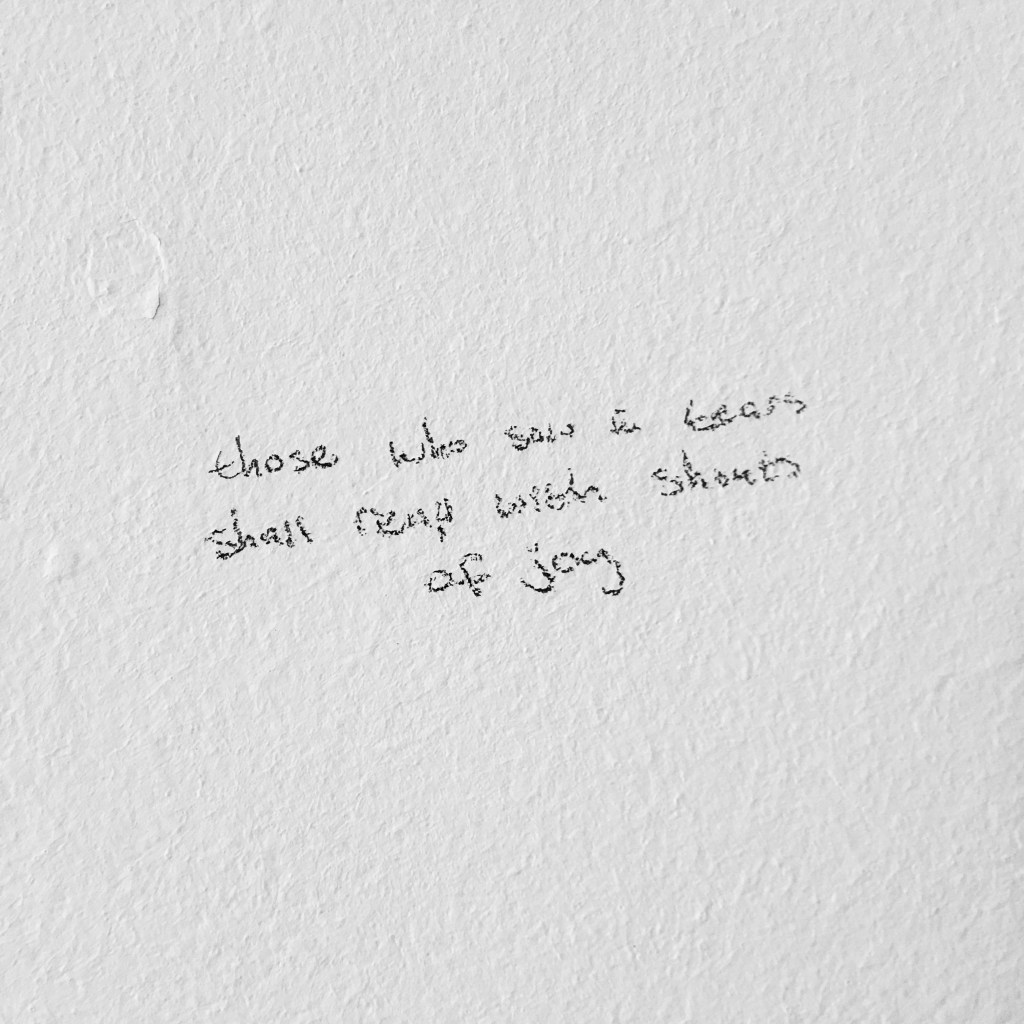 P.S. I’ve been having a very fun time painting our church hall this week. 🙂 Below: day one of painting, and a verse from Psalm 126 that I penciled onto the walls before paint-rolling commenced…